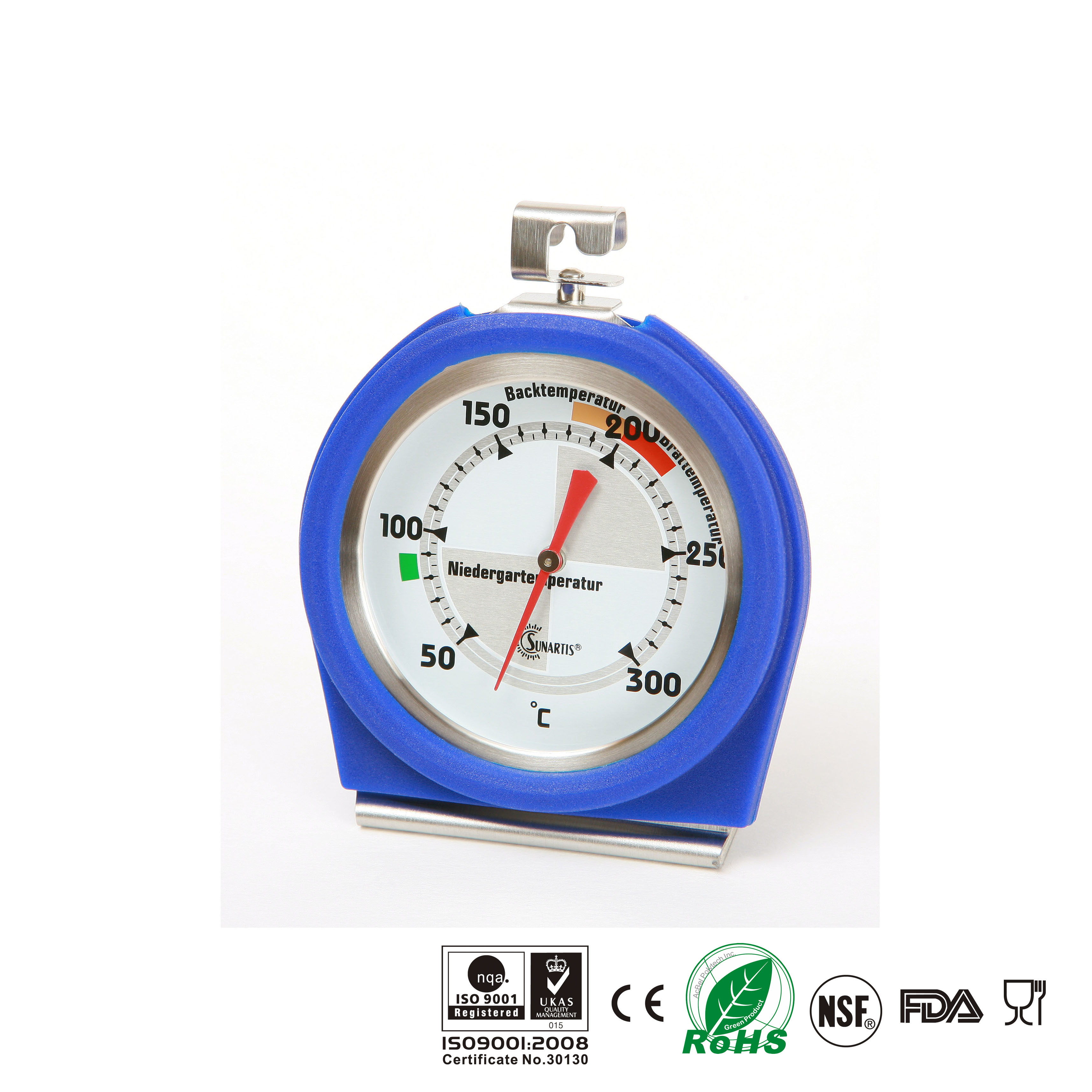 The thermometer is made of stainless steel. It is NSF-approved and its large, easy-to-read dial shows clearly marked temperatures, perfect for professional and home kitchens. It hangs or stands for easy installation and has a lens that will not shatter.